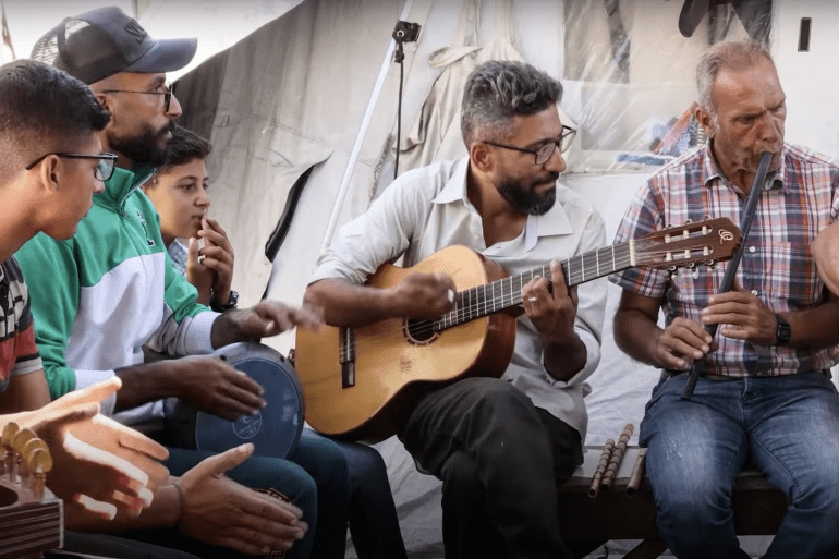 Musician Ahmed Abu Amsha sings with children in a makeshift camp in Gaza [File: Screen grab/Al Jazeera]