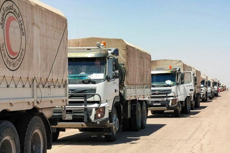 Syrian Red Crescent trucks carrying humanitarian aid arriving at Busra al-Sham in Syria’s southern Deraa province before crossing the buffer zone into Suwayda province [Handout/SANA via AFP]