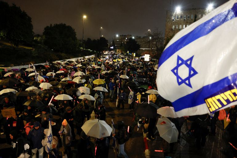 People take part in a rally against the Israeli government and Israeli Prime Minister Benjamin Netanyahu outside the Knesset, Israel’s parliament, in Jerusalem [Ammar Awad/Reuters]