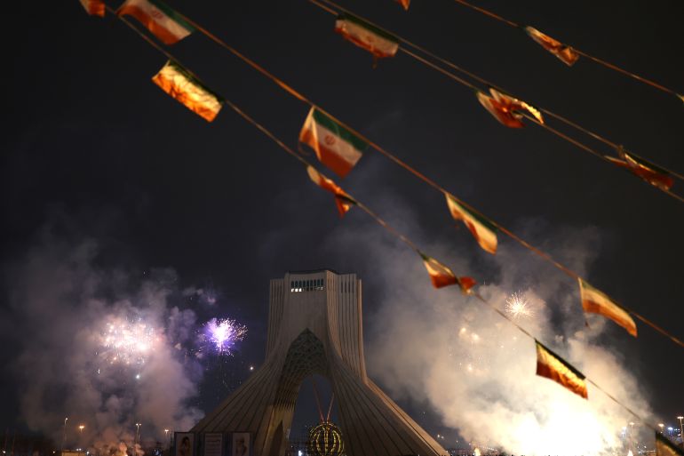 Iranian authorities regularly use Tehran’s Azadi Tower and its surroundings for state-organised events, with this image from February 2022 showing fireworks set off on the occasion of the 43rd anniversary of the Islamic Revolution [File: Majid Asgaripour/WANA via Reuters]