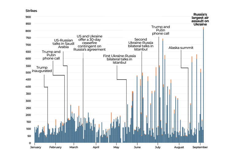 Between January and May 2025, Russian drone strikes averaged about 120 strikes per day. From May to August, drone strikes averaged 185 per day.