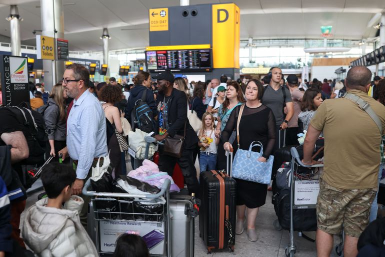Passengers wait at Heathrow after radar failure led to the suspension of outbound flights across the United Kingdom, in Hounslow, London, Britain, on July 30, 2025 [File: Jack Taylor/Reuters]