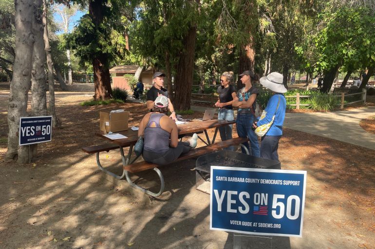 Volunteers meet in a park before canvassing in support of Proposition 50 in Goleta, California, on October 25 [Brian Osgood/Al Jazeera]