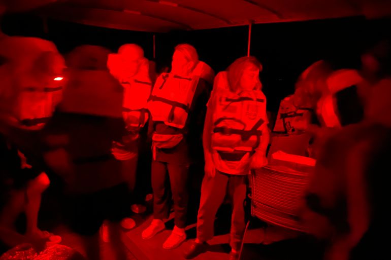 Volunteers talk at the end of the day on board a Flotilla vessel, life vests prepared for any maritime emergency, attack or interception. On September 18, 2025 [Mauricio Morales/Al Jazeera] (Restricted Use)