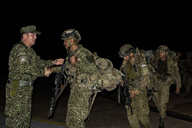 Colombia’s armed forces commander shakes hands with soldiers after their release in San Jose del Guaviare, Colombia, on August 28, 2025 [Colombian Armed Forces/AFP]