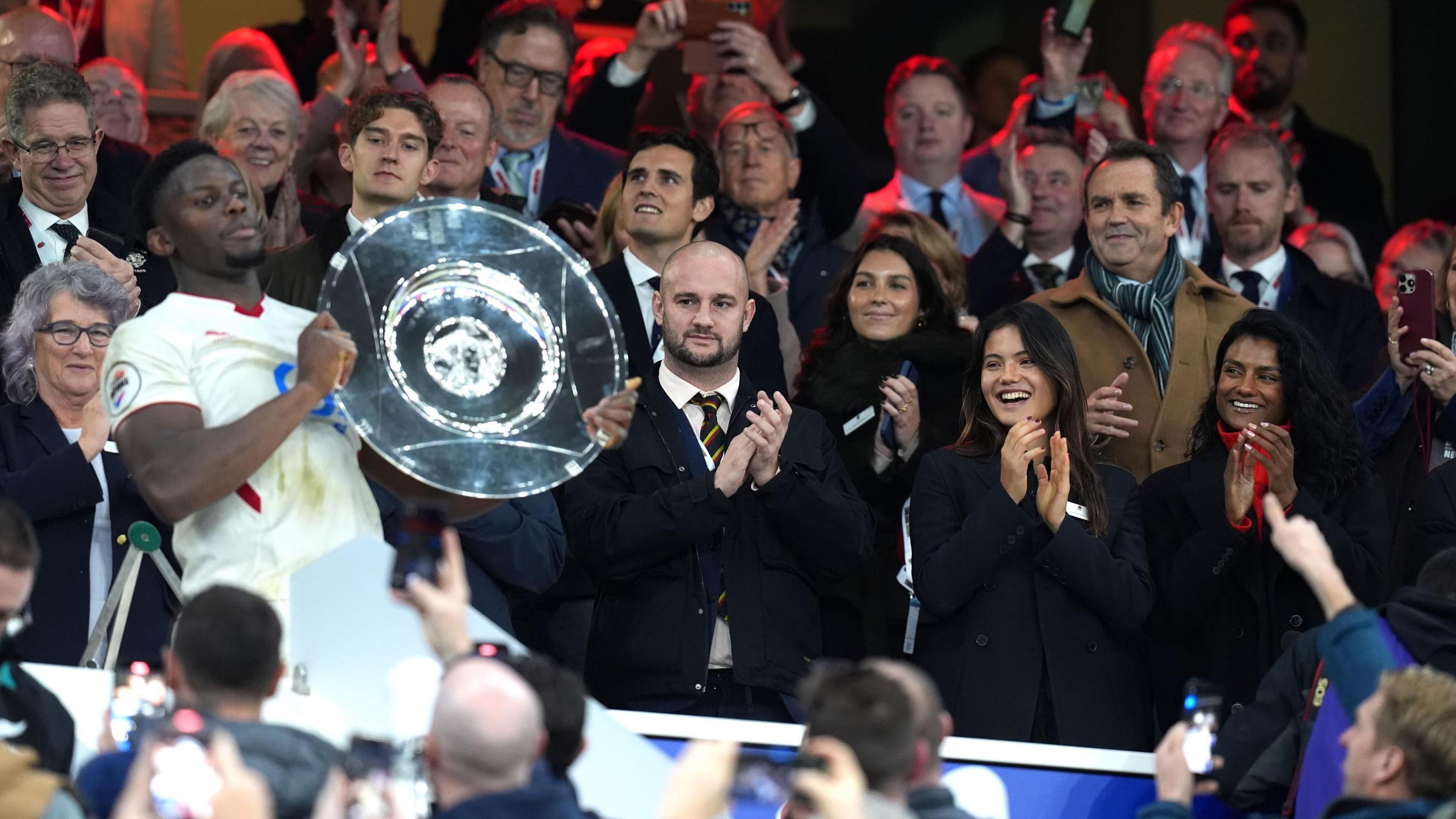 British number one Emma Raducanu, a visitor to England’s Surrey base this week, watches Maro Itoje lift the Hillary Shield
