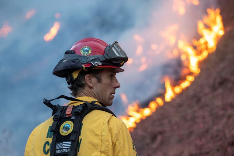 A firefighter watches as the Palisades Fire burns in Mandeville Canyon, a neighbourhood of Los Angeles, California, te United States [Ringo Chiu/Reuters]