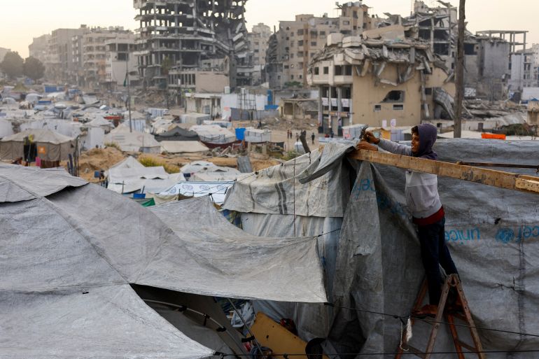 A displaced Palestinian fixes a tent in Gaza City, November 4, 2025 [Mahmoud Issa/Reuters]