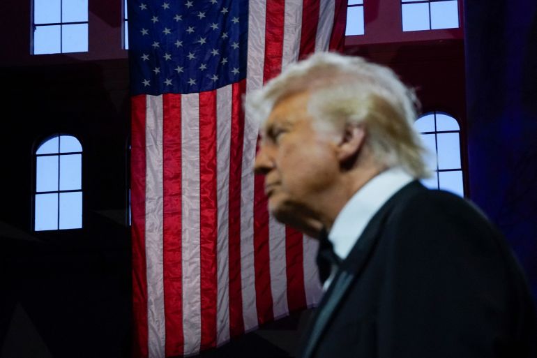 A US flag is pictured in the background as US President Donald Trump attends the National Republican Congressional Committee (NRCC) dinner at the National Building Museum in Washington, DC, April 8, 2025 [File: Nathan Howard/Reuters]