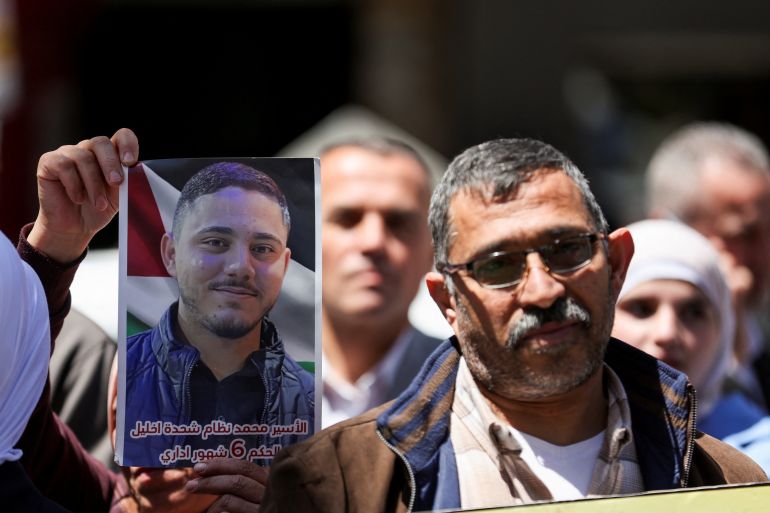 A demonstrators holds a picture during a protest to mark the Palestinian Prisoner’s Day, in Hebron, in the Israeli-occupied West Bank April 17, 2025. [Mussa Qawasma/Reuters]