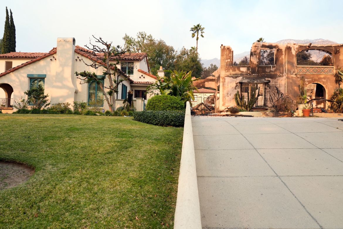 The Walsh House, featured in the television series Beverly Hills 90210, stands undamaged next to a house charred by the Eaton Fire in Altadena, California. [Chris Pizzello/AP Photo]