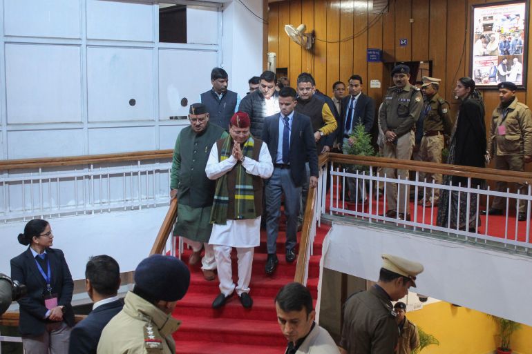 Uttarakhand’s Chief Minister Pushkar Singh Dhami, centre, gestures as he arrives to attend a special session of the state assembly that passed the Uniform Civil Code law in Dehradun, India, February 7, 2024 [AP Photo]