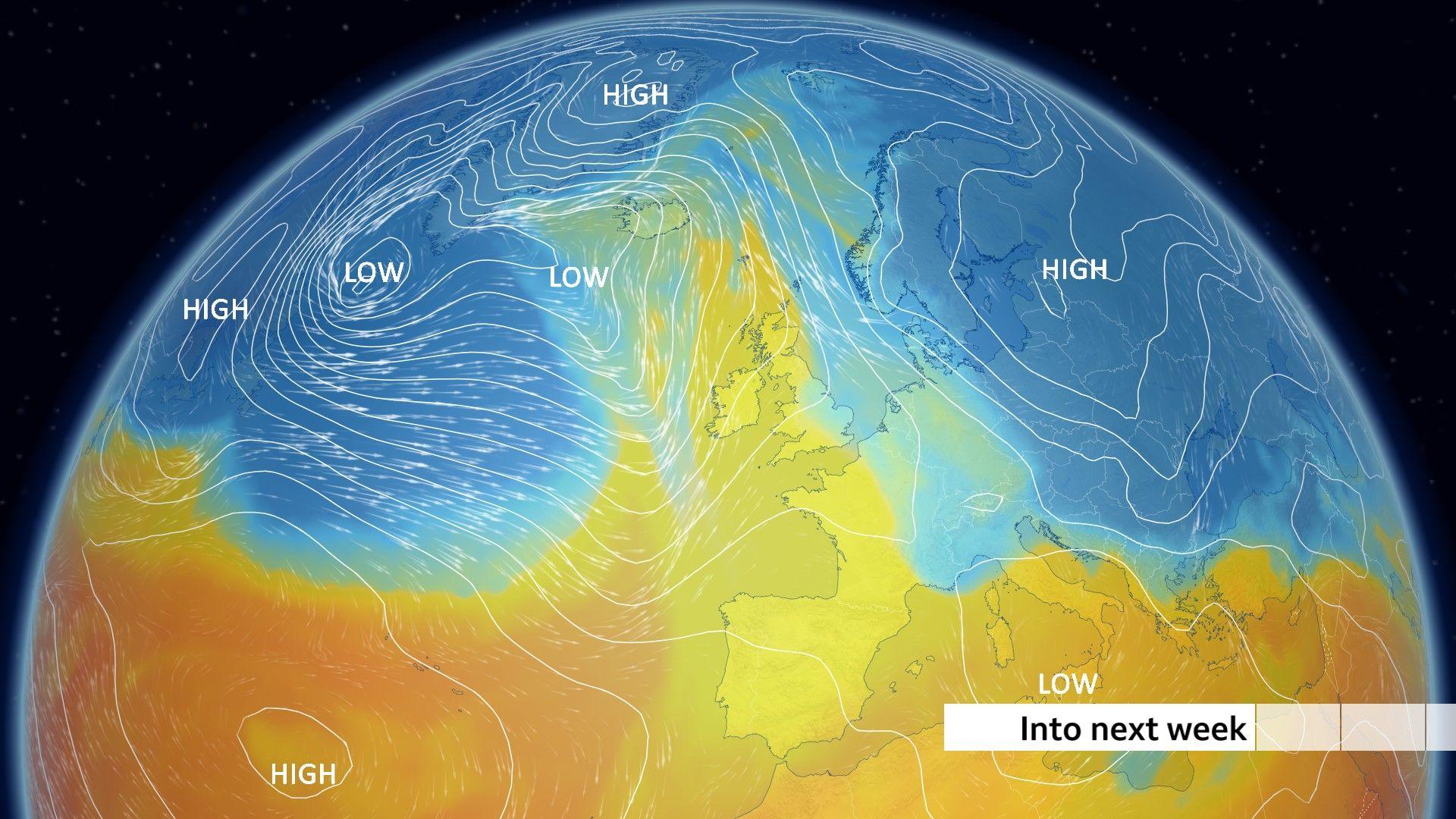 On one hand an Atlantic low pressure system will repeatedly attempt to move in from the west, bringing relatively mild, moist air and unsettled conditions.