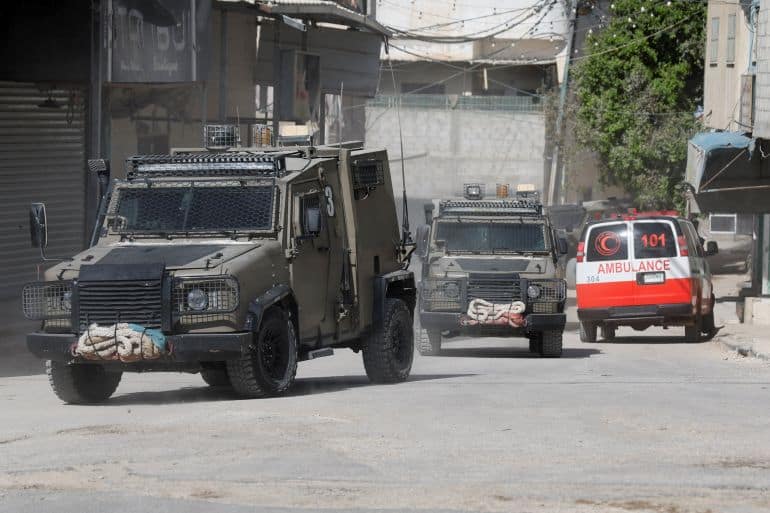 Israeli military vehicles operate during an Israeli raid in the Far’a refugee camp near Tubas, in the occupied West Bank, October 1, 2025 [Raneen Sawafta/Reuters]