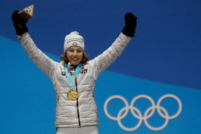 Women’s 7.5km (4.7-mile) biathlon sprint gold medalist Laura Dahlmeier, of Germany, celebrating during the medals ceremony at the 2018 Winter Olympics in Pyeongchang, South Korea in 2018 [Morry Gash/AP]