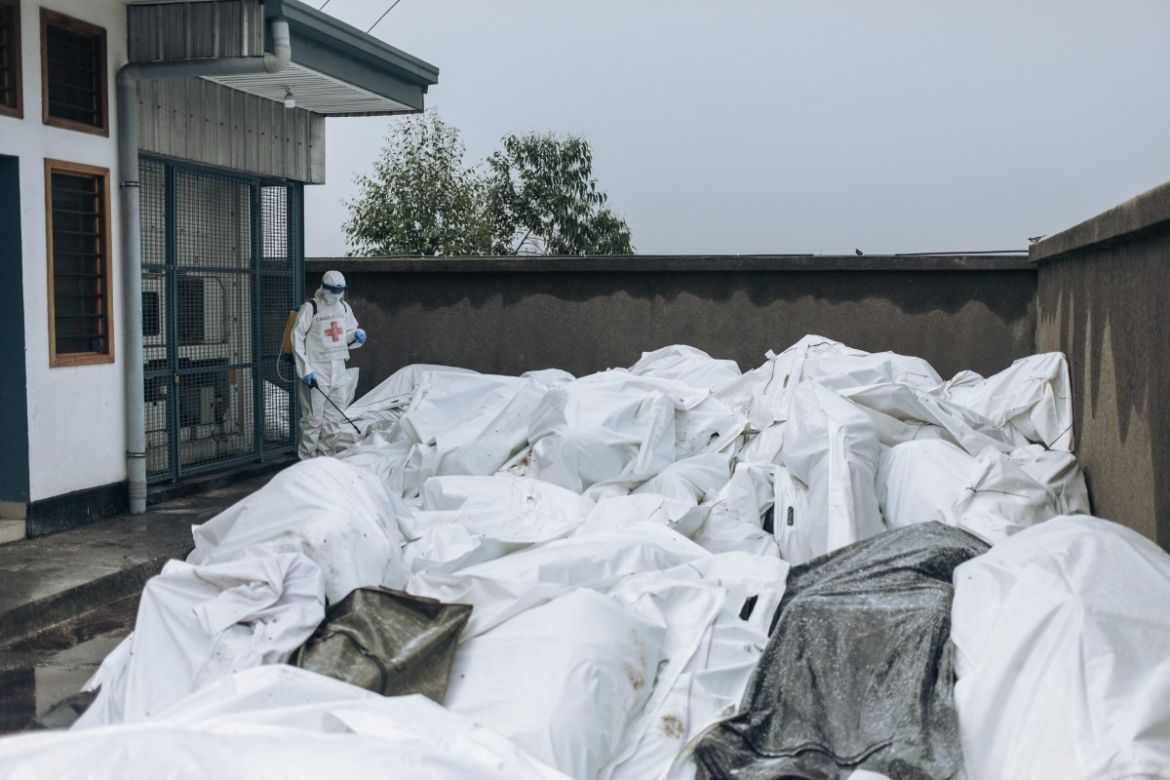 A member of the Congolese Red Cross disinfects body bags in the morgue of Goma General Hospital [Alexis Huguet/AFP]