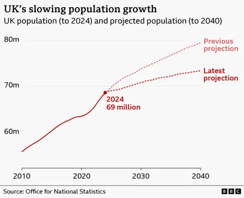 The ONS now expects net migration – the difference between the number of people coming to the UK and those leaving – to add 2.2 million people to the UK population in total between 2024 and 2034.