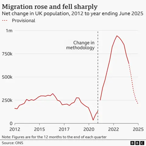 The chart below shows that net migration to the UK peaked near a million people in 2023 and has since fallen to just over 200,000 people.