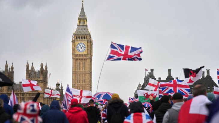 Al Jazeera witnessed people waving an assortment of flags – Union Jacks, the red and white St George’s Cross of England and the Israeli Star of David – chanting “[Keir] Starmer is a w*****” as they flocked to see famous far-right speakers next to the UK Prime Minister’s Downing Street residence, including Robinson, Katie Hopkins, and Steve Bannon.