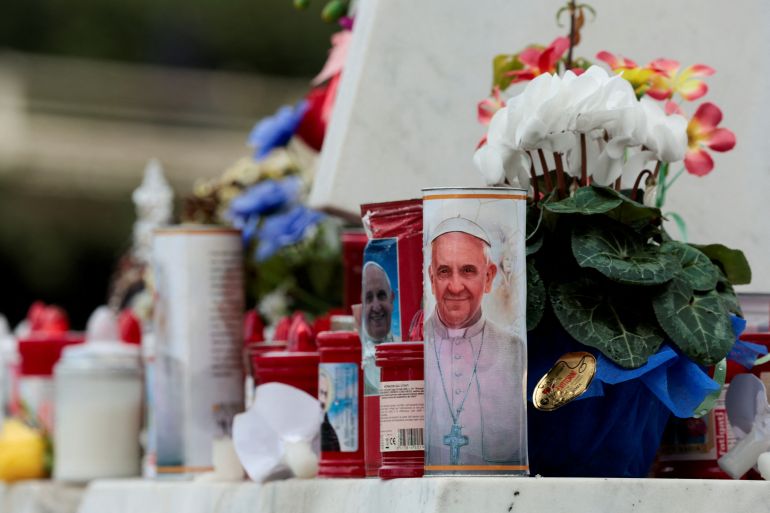 Flowers and candles are left by the statue of late Pope John Paul II outside the Gemelli Hospital where Pope Francis is admitted for treatment, in Rome, Italy, February 20, 2025 [Remo Casilli/Reuters]