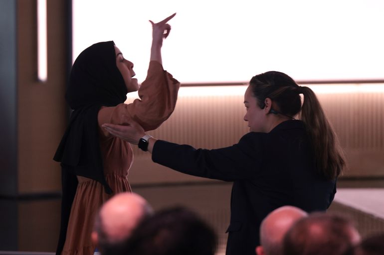 Aboussad continued, shouting that Suleyman and “all of Microsoft” had blood on their hands. She also threw onto the stage a keffiyeh scarf, which has become a symbol of support for Palestinian people, before being escorted out of the event.