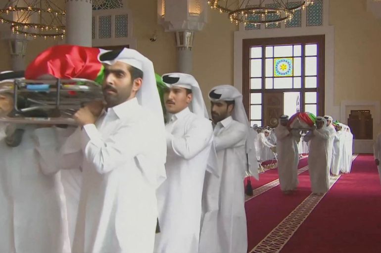 One coffin bearing a Qatari flag and five others bearing Palestinian flags were brought to Doha’s Imam Muhammad ibn Abd al-Wahhab Mosque, live footage from Qatar television showed on Thursday.