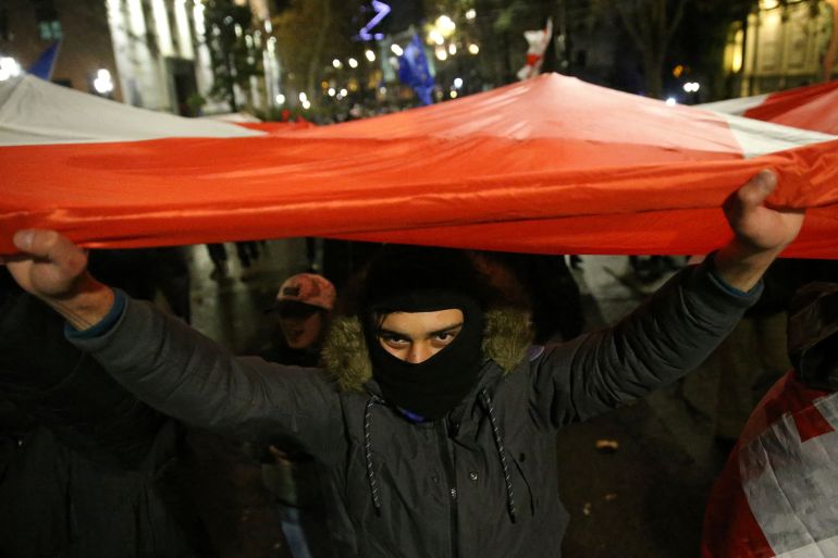 A demonstrator carries the Georgian flag during a rally held by supporters of Georgia’s opposition parties, who protest against the government’s decision to suspend talks on joining the European Union, in Tbilisi, Georgia December 13, 2024 [File: Irakli Gedenidze/Reuters]