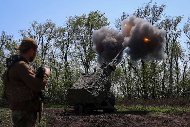 A Ukrainian Armed Forces soldier stands near an Archer self-propelled howitzer as it is fired towards Russian troops, in the Zaporizhia region, Ukraine, on April 24, 2025 [Anatolii Stepanov/Reuters]
