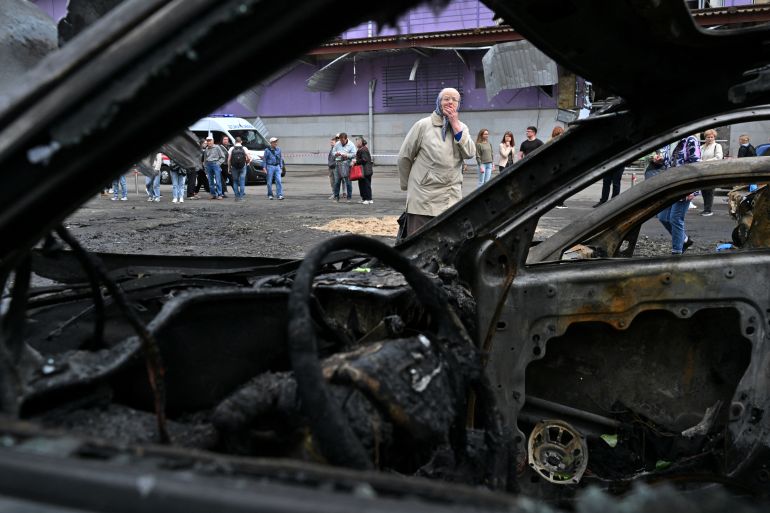An elderly woman reacts as she looks at burned cars parked outside a mall following a nighttime drone attack on Kyiv, on May 4, 2025 [Sergei Supinsky/AFP]