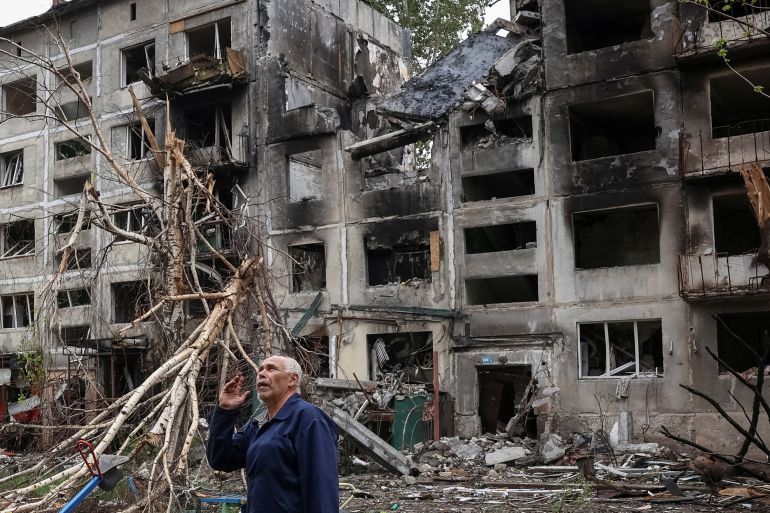 A resident stands near buildings damaged by Russian military strikes in the front line town of Myrnohrad in Ukraine’s Donetsk region on Thursday [Anatolii Stepanov/Reuters]