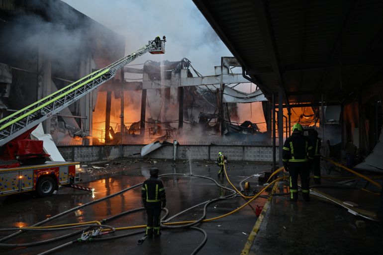 A fire broke out at a non-residential building in Kyiv following a Russian strike [Genya Savilov/AFP]