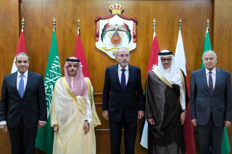 Left to right, Egypt’s Foreign Minister Badr Abdelatty, Saudi FM Prince Faisal bin Farhan Al Saud, Jordanian FM Ayman Safadi, Bahrain’s FM Abdullatif bin Rashid al-Zayani, and Arab League Secretary-General Ahmed Aboul Gheit in Amman on June 1, 2025 [Jordanian Ministry of Foreign Affairs and Expatriates via AFP]