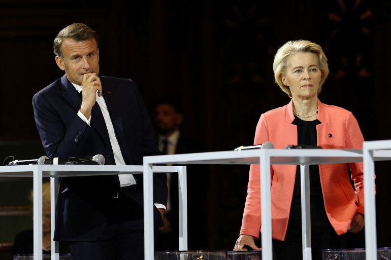 French President Emmanuel Macron and European Commission President Ursula Von der Leyen attend the “Choose Europe for Science” event in the amphitheatre of the Sorbonne University in Paris [Gonzalo Fuentes/Reuters]