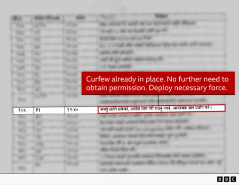 The BBC World Service team has seen an internal police document detailing events on 8 September. It reveals someone using the call sign “Peter 1” told his officers to “deploy necessary force” 10 minutes after a curfew had come into effect, and after repeated requests by officers on the ground to use lethal force.