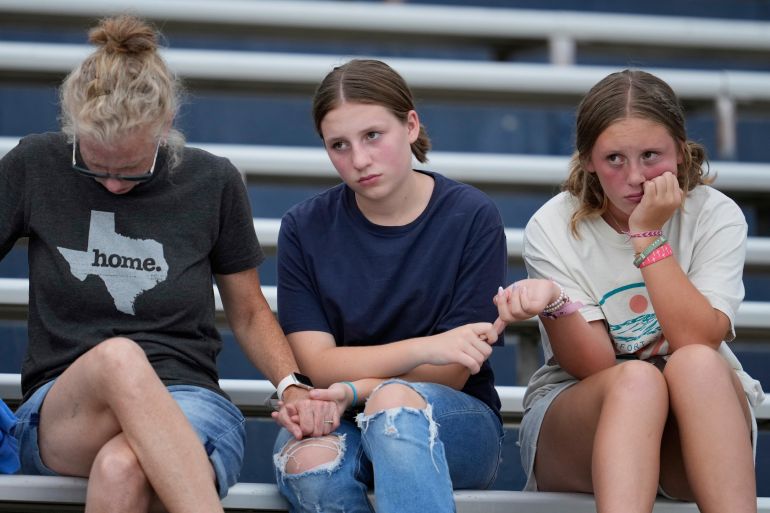 Blue shirts bearing the school’s slogan, Tivy Fight Never Die, and green ribbons for Camp Mystic – a century-old all-girls Christian camp where at least 27 campers and counsellors died – were worn by many attendees. Officials said five campers and one counsellor from the camp remain unaccounted for.