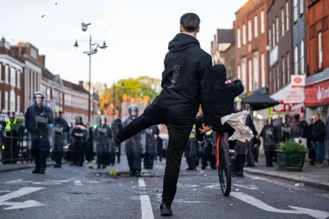 Five people, aged between 15 and 23 from across Surrey and London, have now been arrested on suspicion of public order offences and criminal damage after “missiles” were thrown at officers.