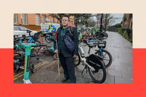 Matthies, who is registered blind and a policy lead at the Royal National Institute of Blind People, says e‑bike pavement clutter is the top transport complaint he hears from blind people.