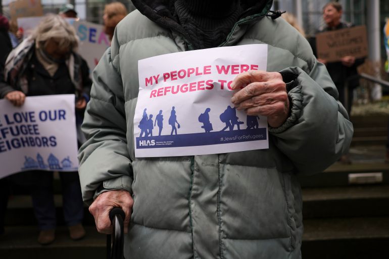 Martin Bernstein, 95, whose parents were refugees, attends a February 25 protest against Donald Trump’s refugee policies in Seattle, Washington [File: Ryan Sun/The Associated Press]