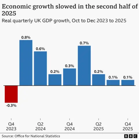 Getty ImagesThe UK economy saw a lacklustre end to 2025, growing by a slightly lower-than-expected 0.1% in the final quarter of the year.
