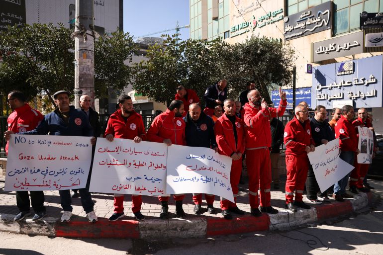 Paramedics from the Palestinian Red Crescent Society (PRCS) hold placards during a protest to denounce the deaths of their colleagues in the occupied West Bank city of Hebron in a separate incident [File: Hazem Bader/AFP]