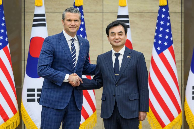 US Defense Secretary Pete Hegseth, left, shakes hands with South Korean Defence Minister Ahn Gyu-back in Seoul, South Korea, on November 4, 2025 [Handout/South Korean Defence Ministry/AFP]