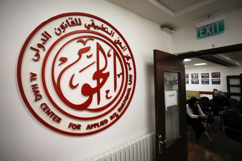The logo of the Palestinian human rights organisation Al-Haq is seen in its offices in Ramallah in the Israeli-occupied West Bank in 2021 [Mohamad Torokman/Reuters]