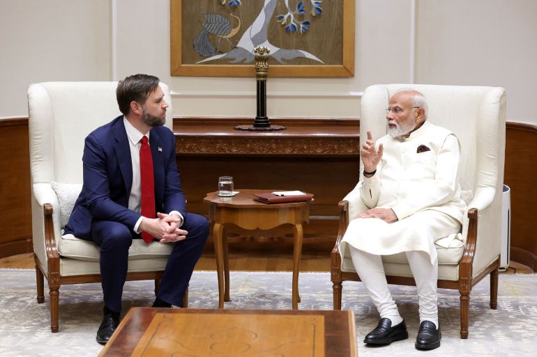 New Delhi, India – The optics were warm: As United States Vice President JD Vance and his family visited Narendra Modi on Monday evening, the Indian prime minister showed them around his residence and gave each of the American leader’s three children a peacock feather.