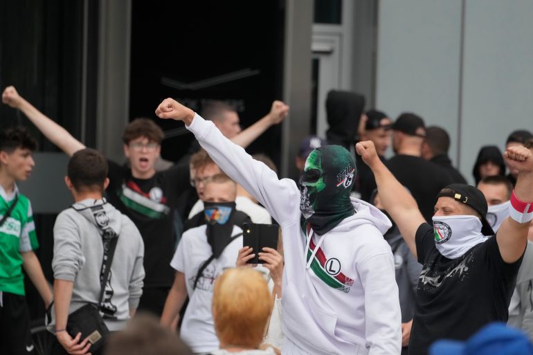 Three elderly women proudly waved white-and-red Polish flags among the football fans. “The nation has had enough of what’s happening. It’s waking up because we’re living under terror, being humiliated,” said Danuta, 60, who also did not want to give her full name. “The borders are not sealed and have to be defended by civilians,” she added, referring to the right-wing groups who patrol the Polish-German border.