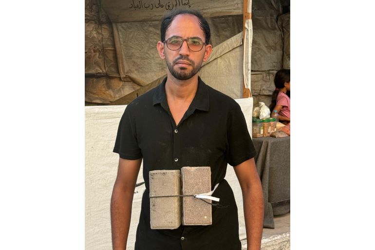 Gaza City, Gaza Strip – Hani Abu Rizq walks through Gaza City’s wrecked streets with two bricks tied against his stomach as the rope cuts into his clothes, which hang loose from the weight he has lost.