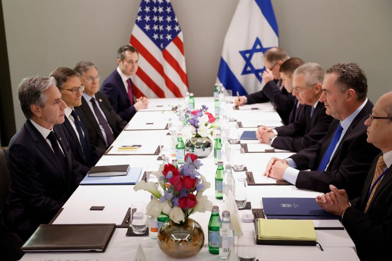 US Secretary of State Antony Blinken, left, attends a meeting with Israel’s Foreign Minister Israel Katz, second right, in Tel Aviv, Israel, on January 9, 2024 [Evelyn Hockstein/Pool Photo via AP]