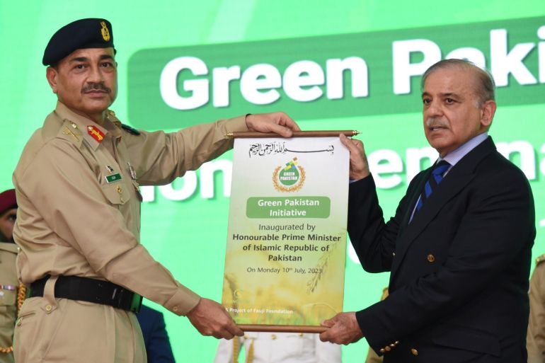 Pakistan’s army chief General Asim Munir (left) hands over the inaugural scroll of the Green Pakistan Initiative to Prime Minister Shehbaz Sharif in July 2023 [Handout/Prime Minister’s Office]