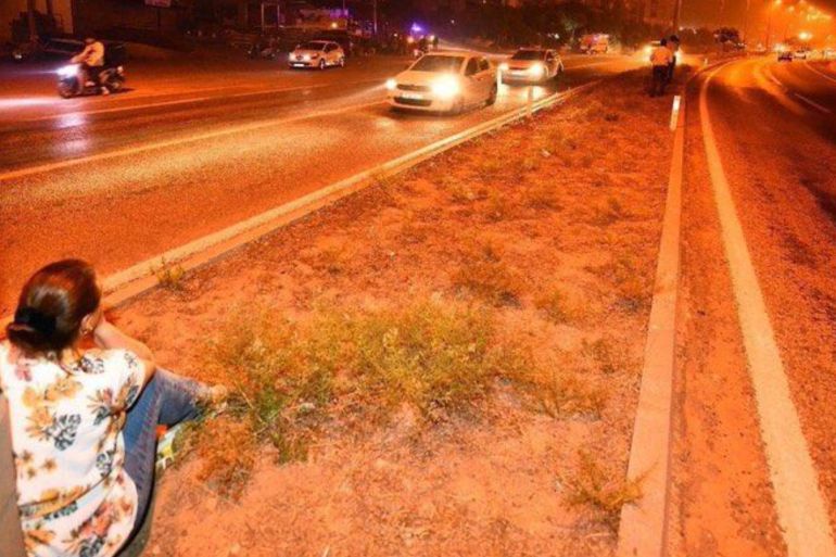 A woman sits on a road’s median strip to watch the flames in Serinyol, Hatay [Courtesy of Ethem Askar]