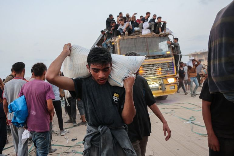 Palestinians carry aid parcels brought into northern Gaza through the Zikim border crossing in July [File: Omar al-Qattaa/AFP]